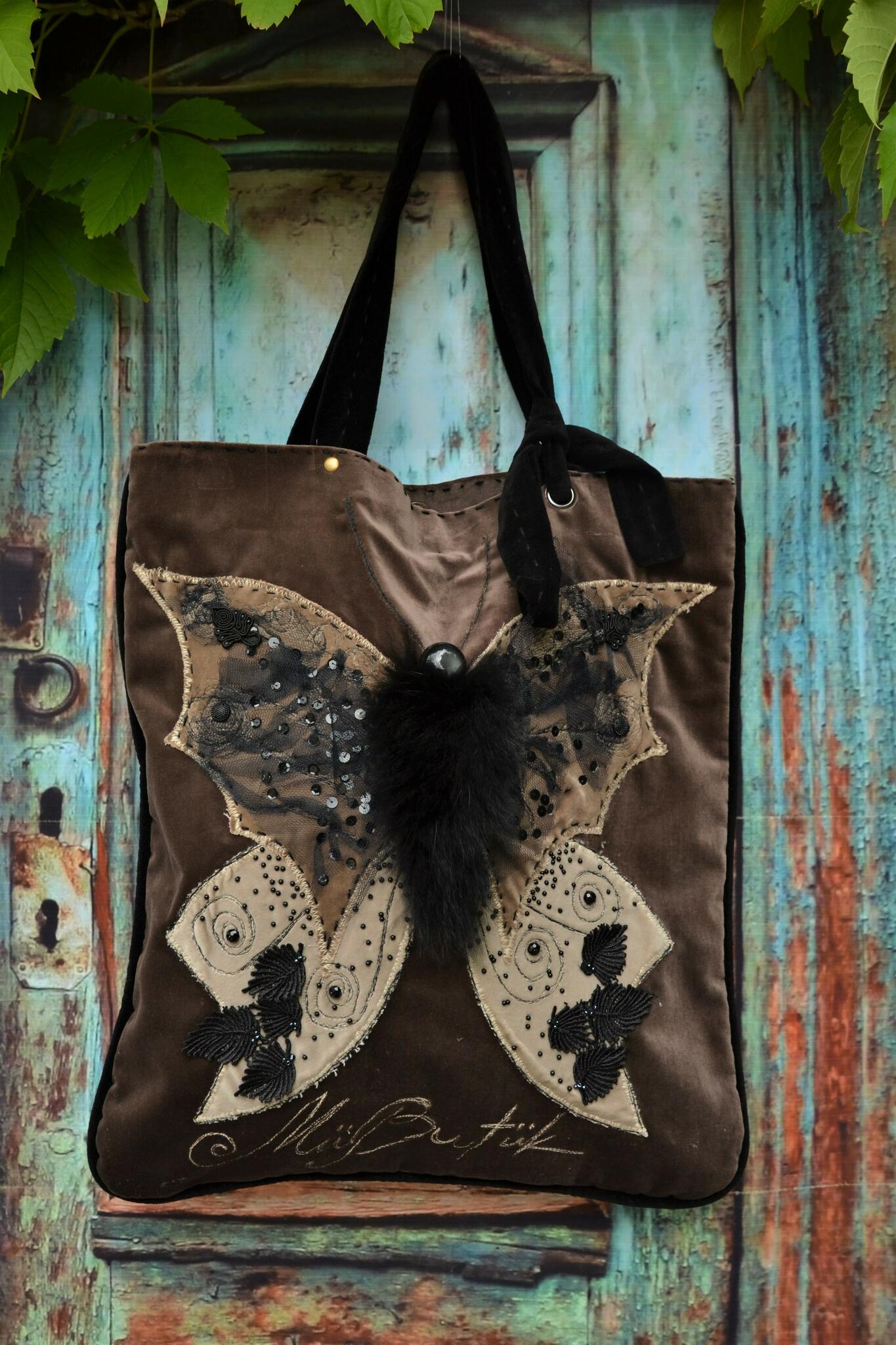 Kandekott valmistatud sametkangast, voodriga, reguleeritavad sametkangast sangad. Liblikas on käsitsi tikitud.