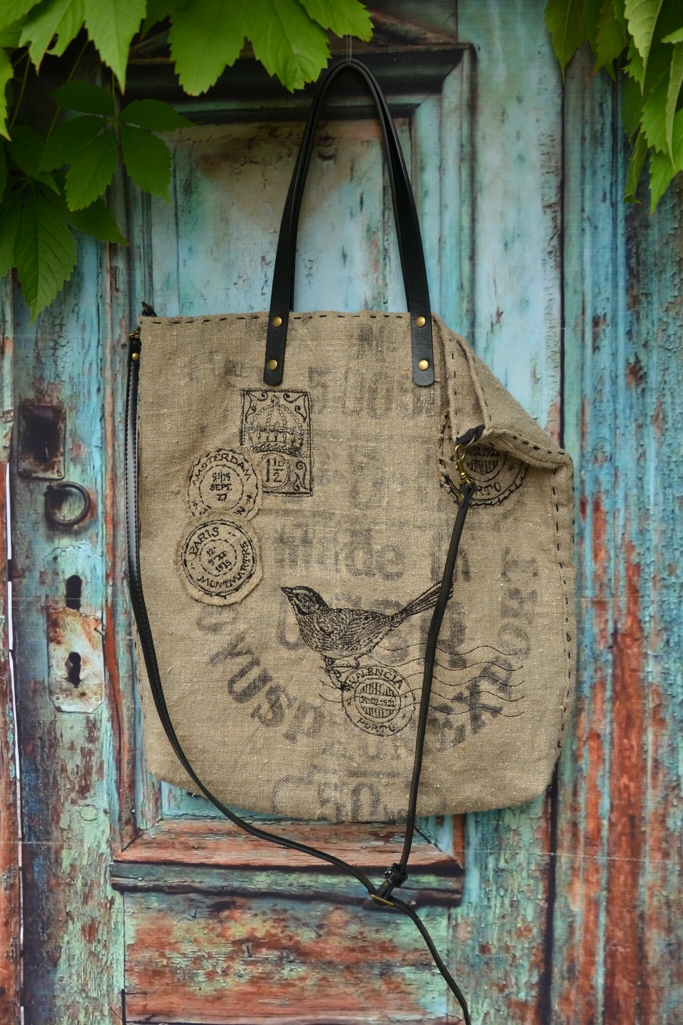 Kandekott valmistatud käsitööna. Materjal, taaskasutus, masintikandid, voodriga, kunstnahast sangad.Kangas kartulikotiriie.